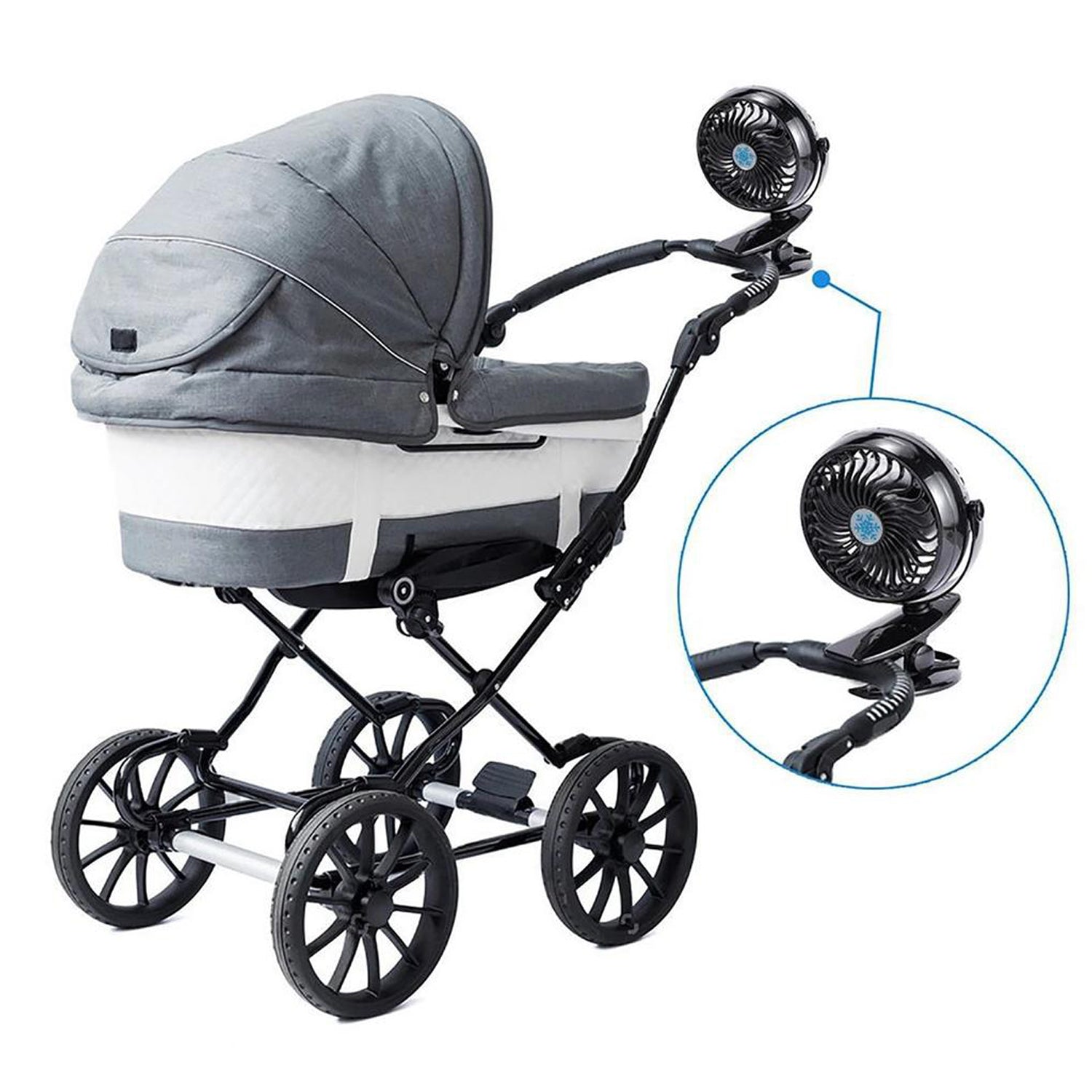 Mini USB clip fan shown with various settings for adjustable cooling