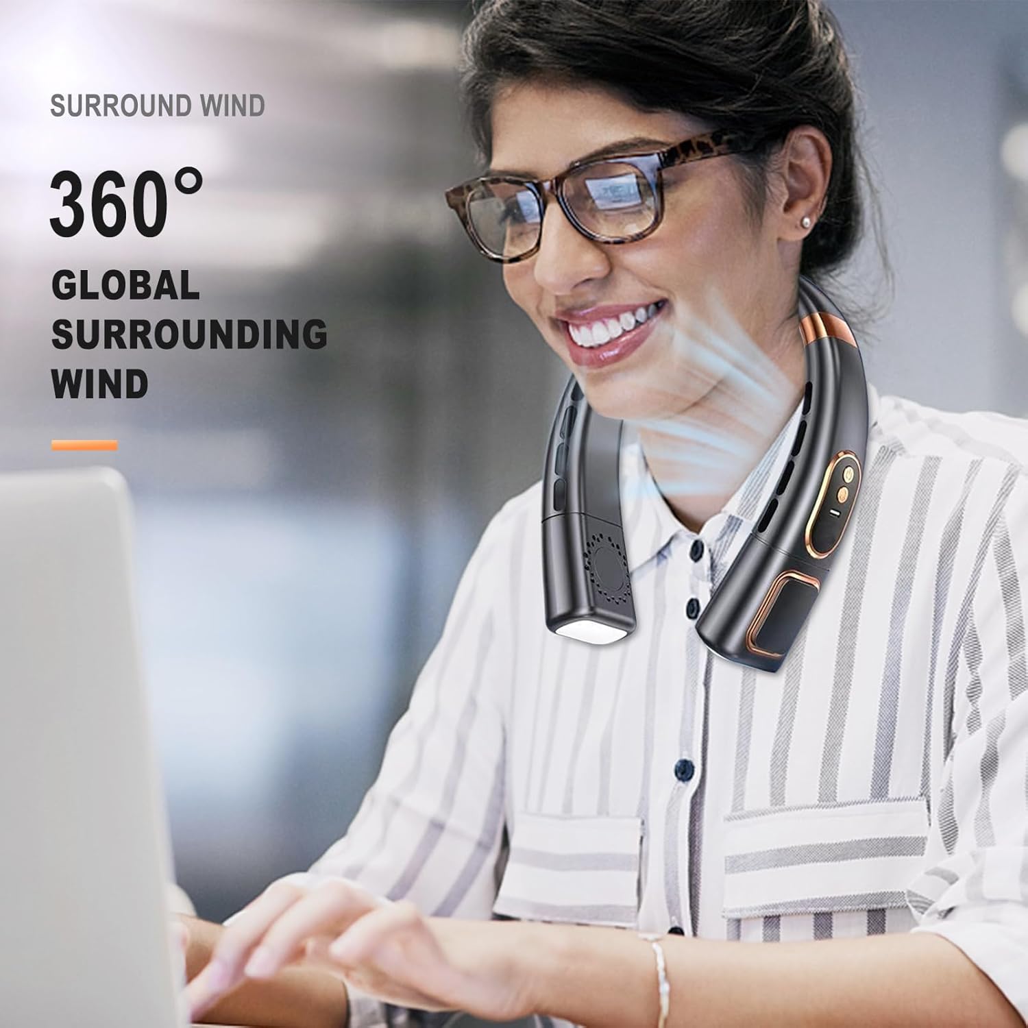 Hands-free wearable neck fan design that sits comfortably around the neck for all-day personal cooling.