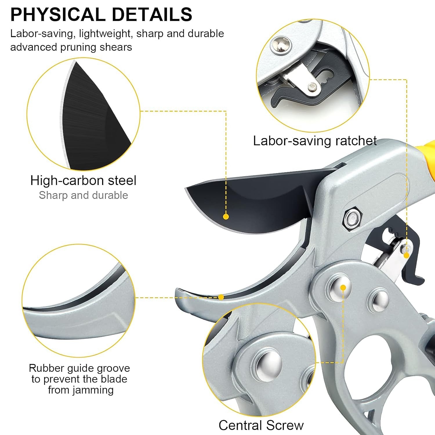 - [Effortless Design] - The ratcheting mechanism's settings multiply your hand's power by up to 3 times. As you cut through a branch, the ratcheting mechanism clicks and moves to the next setting, providing ever-increasing pressure as you cut. Makes tough cuts easier and helps reduce wrist strain and fatigue. 4X the cutting power to make pruning, cutting and grafting a breeze. The ratchet only engages when actively in use.