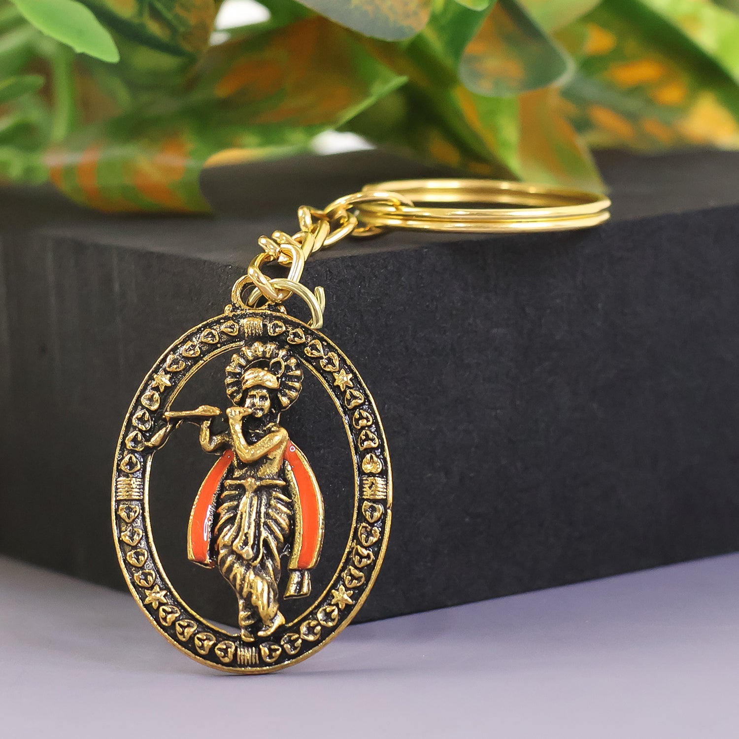 Metal Traditional Decorative Lord Krishna Keychain with Antique-Finish Oval Frame, Premium Religious Key Ring for Keys, Bags, Vehicles & Gifting – Single PieceÂ
