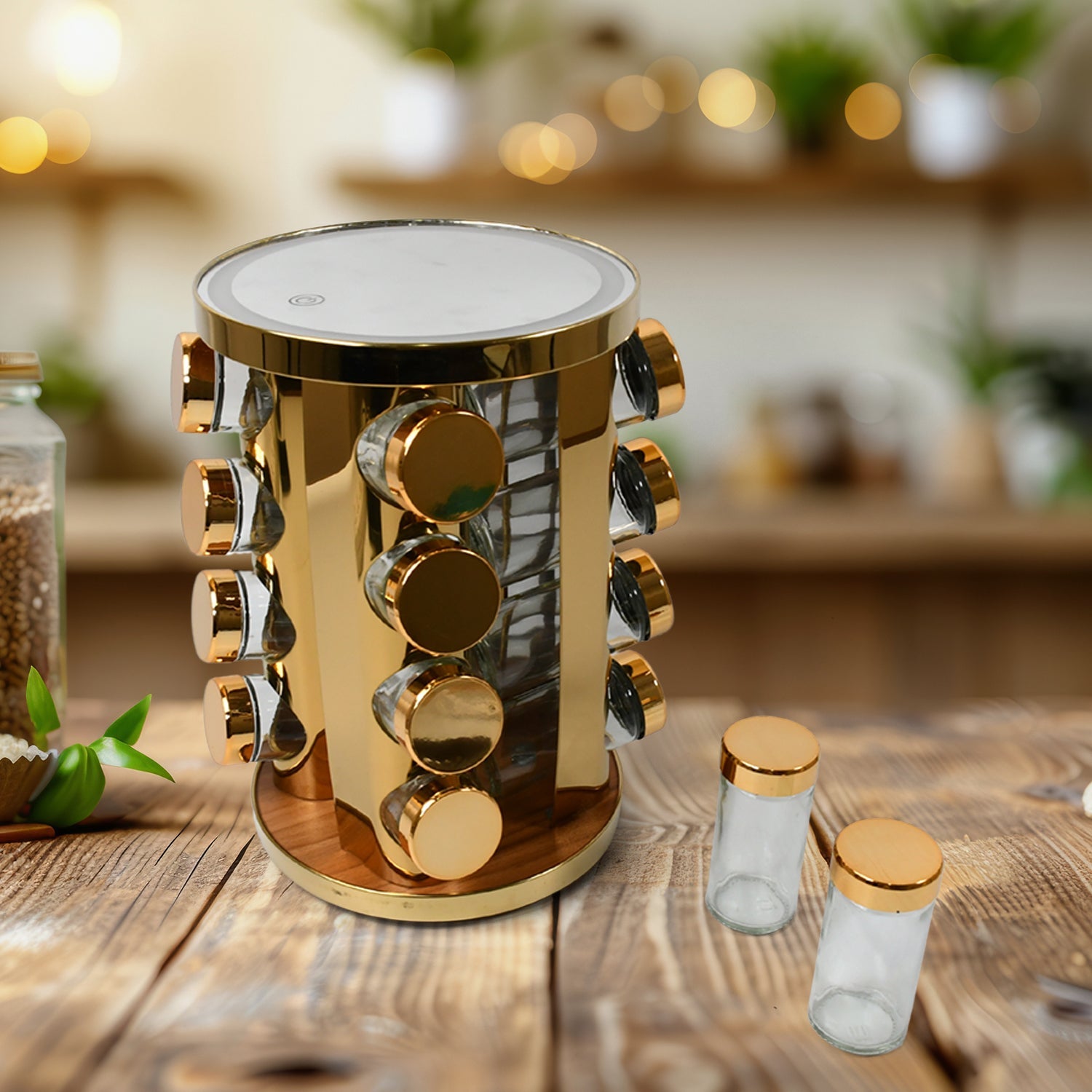 LED Spice Rack Organizer, Rotating Spice Rack with Free 16 Seasoning Jars, Revolving Tower Organizer Stainless Steel for Kitchen Storage (Golden / 16 Pc / MOQ - 6 pc)
