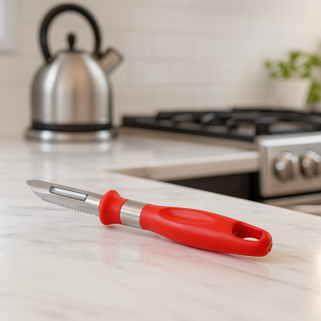 vegetable peeler, fruit peeler,peeling knife, cutting tool, kitchen knife, slicer,fruit cutting,serrated knife peeler, combo peeler, plastic handle peeler, red handle peeler, stainless steel peeler