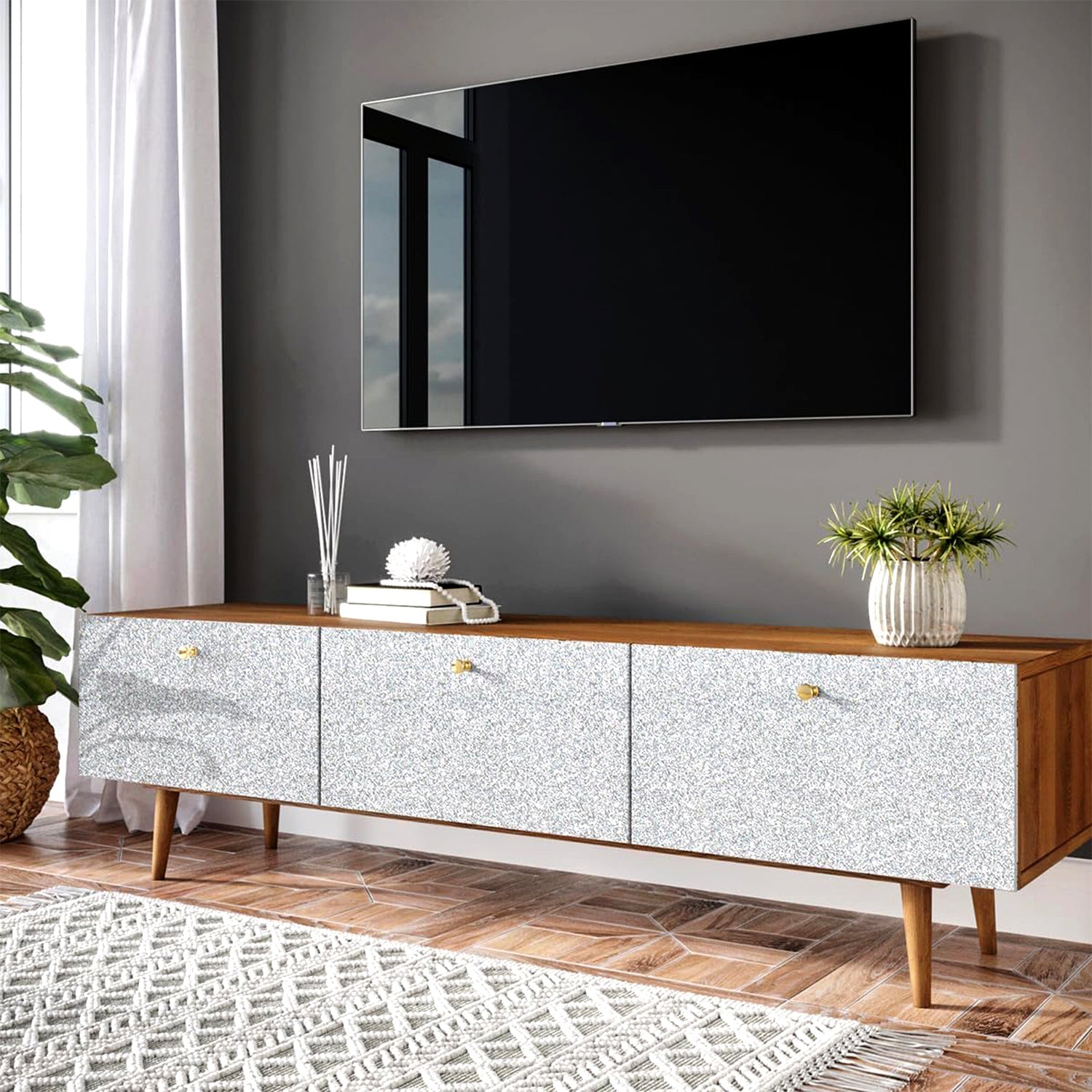 Luxury Glitter Self-Adhesive Vinyl Wallpaper Roll – Sparkling Decorative Wall Covering Film for Home, Bedroom & Office Renovation – Waterproof Peel & Stick Wall Sticker – 45cm x 10m (Silver Shimmer Finish)
