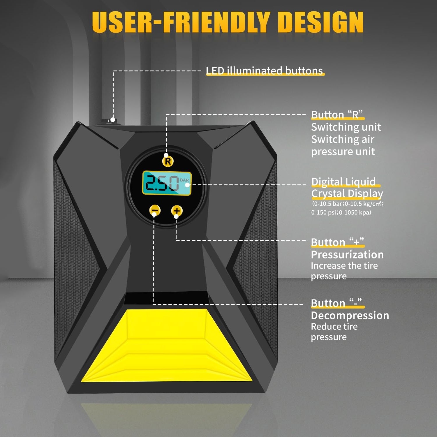 Auto cut-off at the set PSI/Bar/KPa value for safer inflation