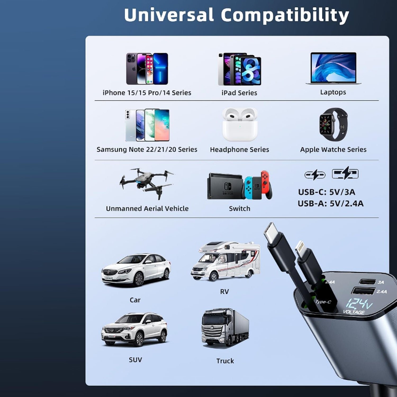 4-in-1 Super Fast Car Charger with Dual Built-In Cables, Dual USB Ports,