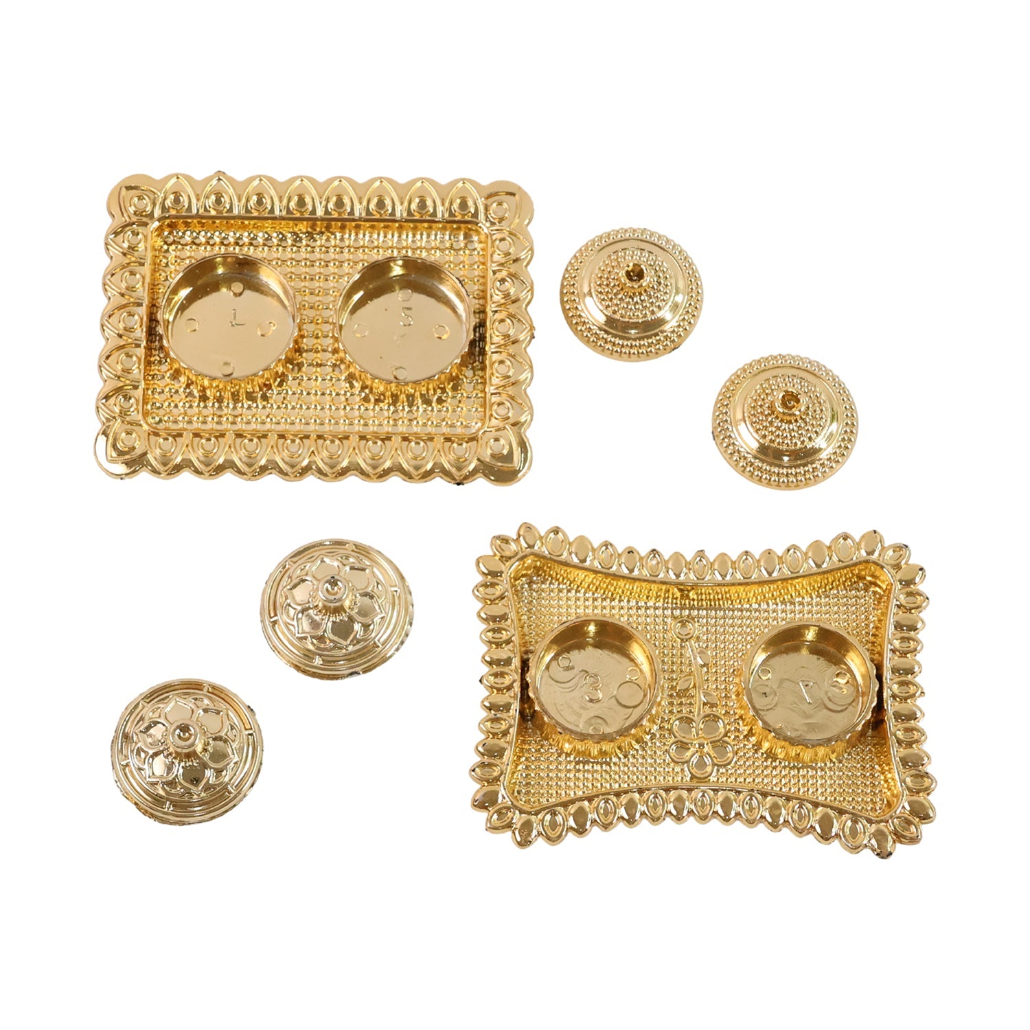 Grace your rituals with this elegant rectangular pooja tilak plate featuring a richly embossed base, scalloped border and two matching lidded containers for roli–chawal or haldi–kumkum. Each piece comes in assorted mix designs, crafted to sparkle under diya light and elevate any mandir setup or welcome ceremony. Compact and stable for tabletop use, the plate keeps essentials organized while adding a traditional touch to décor. Built with a durable decorative finish, it’s simple to maintain—just wipe and place back on the altar. A refined choice for daily puja and a thoughtful festive gift.