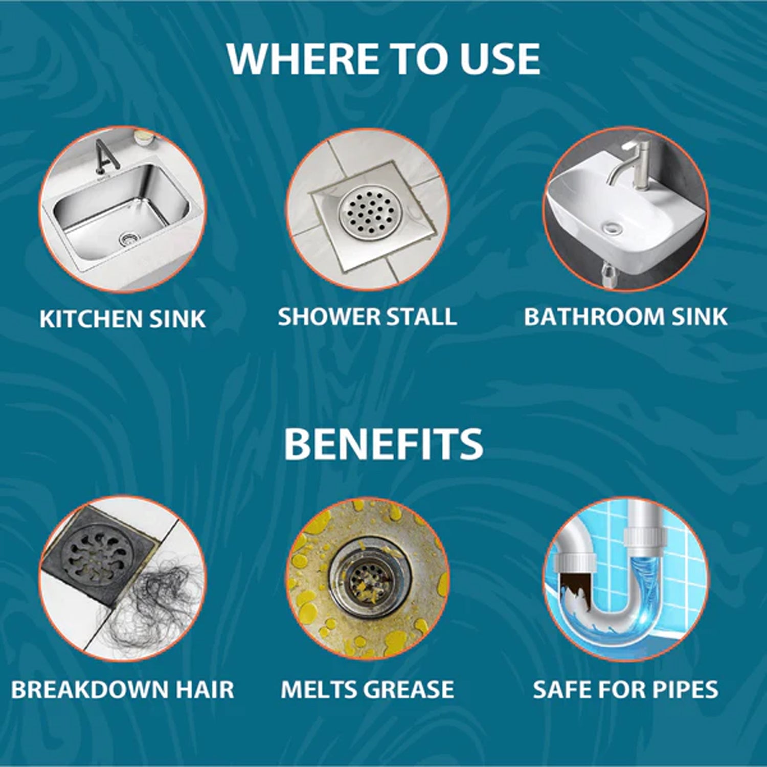Powerful drain cleaner, drain cleaner sachet, fast-acting clog remover, kitchen sink cleaner, bathroom drain cleaner, floor trap cleaner,grease remover, soap scum remover,toilet drain cleaner, eco-friendly drain cleaner, concentrated drain cleaner
