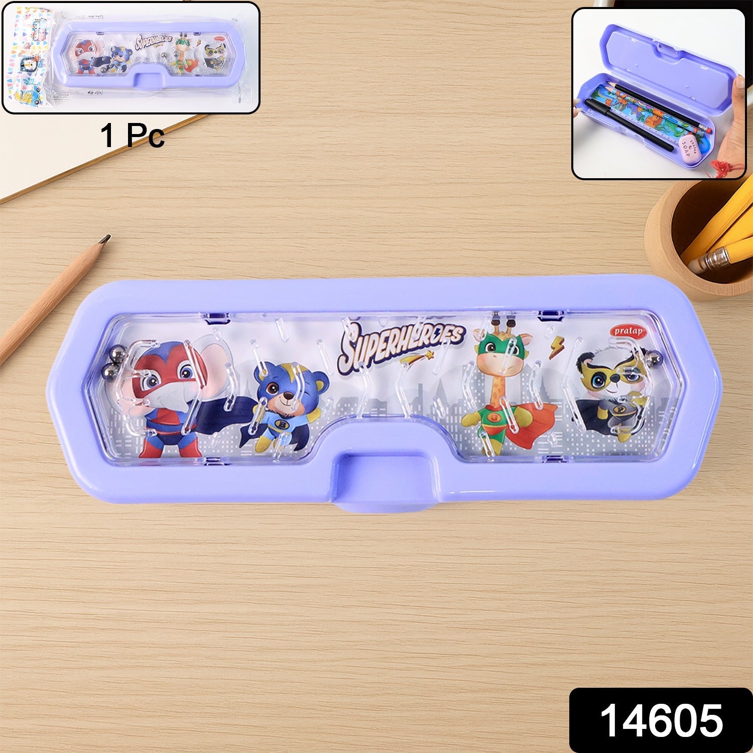 Make school time more exciting with this fun and functional Cartoon Printed Plastic Pencil Box for Kids, designed to store school essentials and keep kids entertained. The pencil box features popular animated character designs and comes with a built-in metal ball maze puzzle game on the lid for playful learning and interactive fun.