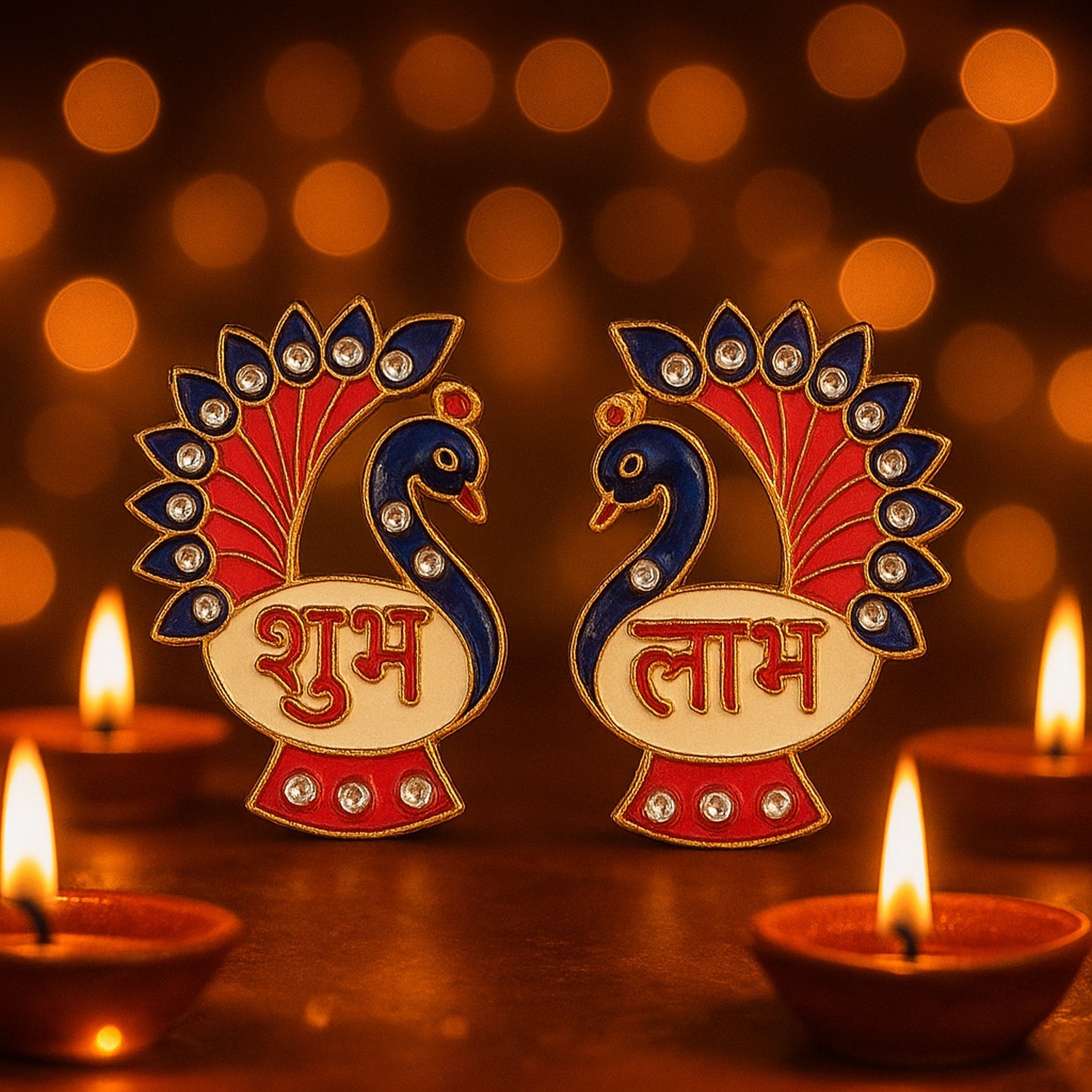 Adorn your home with this elegant 2-piece Shubh Labh wall hanging set crafted in a beautiful peacock design. Embellished with sparkling stones, vibrant colors, and traditional motifs, this set brings auspiciousness, prosperity, and positivity to your space. Ideal for decorating entrances, pooja rooms, or living areas, it is a perfect blend of tradition and artistry. These hangings not only enhance festive celebrations like Diwali and Navratri but also serve as thoughtful gifts for housewarmings and religious occasions. Lightweight, durable, and reusable, they make a timeless decorative accessory.